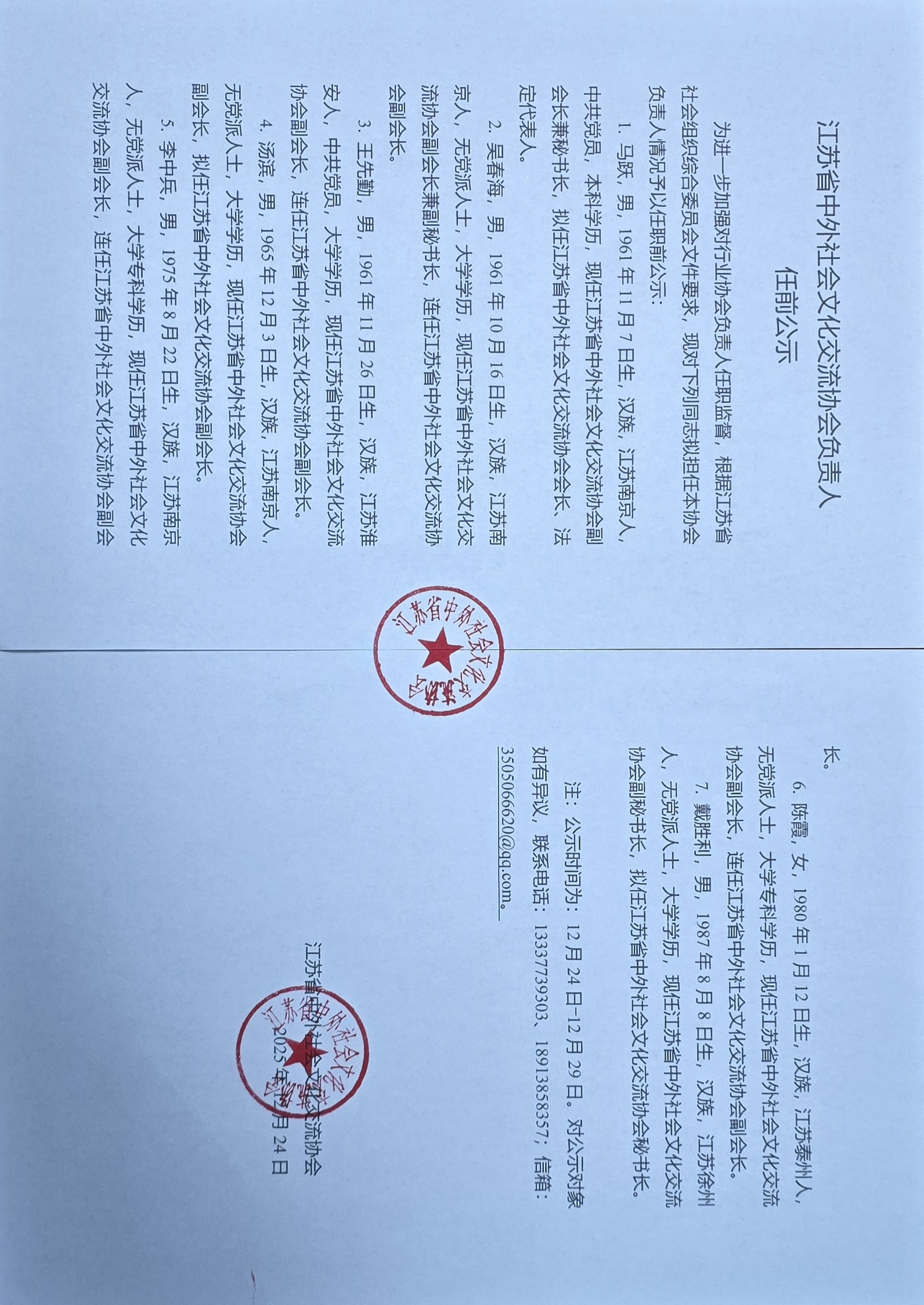 江苏省中外社会文化交流协会负责人任前公示